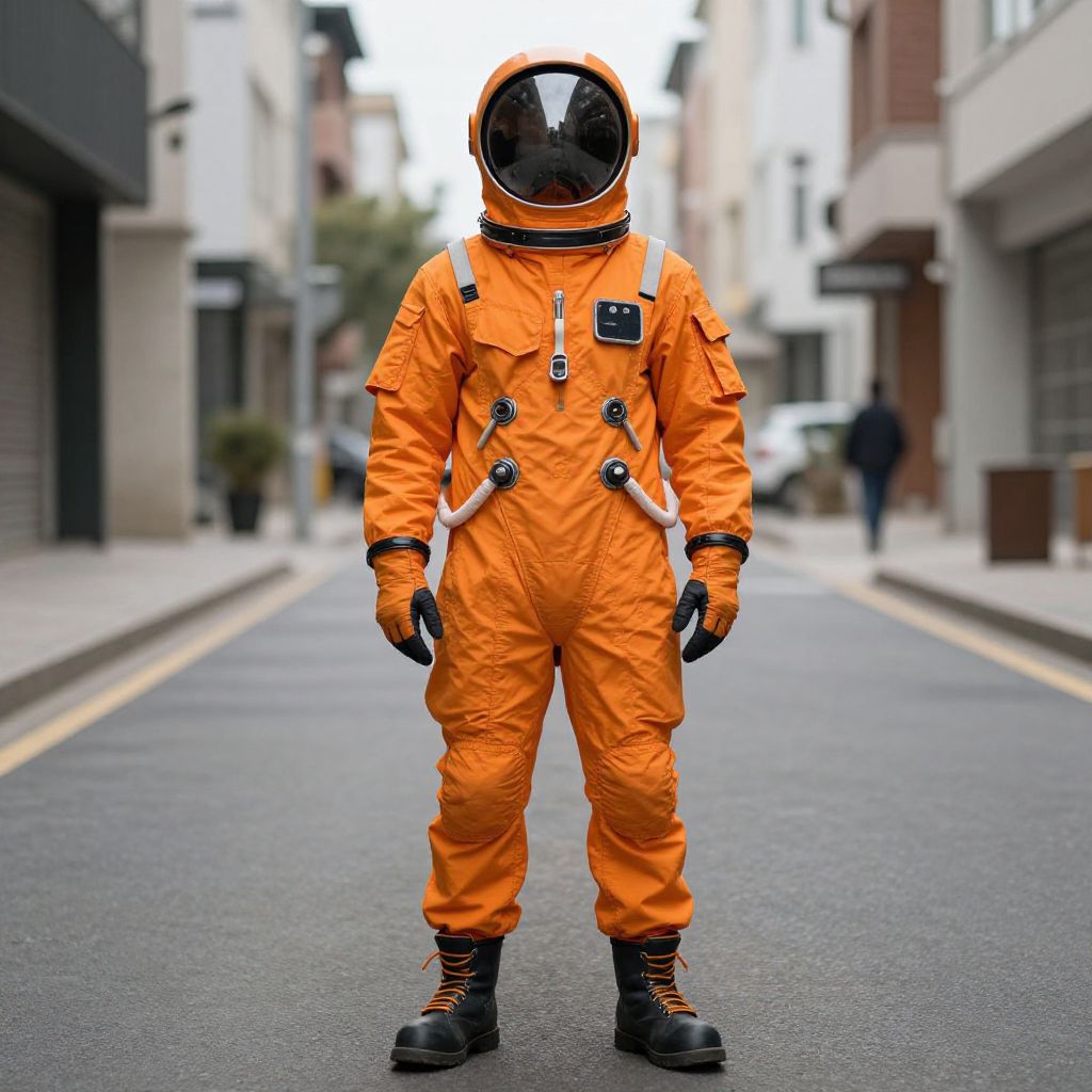 "Yellow Astronaut Costume, man in an orange space suit standing on a street"