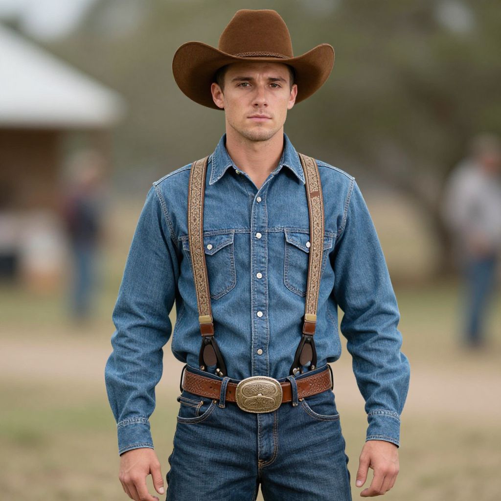 Cowboy fancy dress costume, 1boy, male focus, solo, suspenders, hat, cowboy hat, belt, shirt, pants, looking at viewer, denim, cowboy western, blurry background, brown belt, belt buckle, buckle, blurry, cowboy shot, long sleeves, closed mouth, brown headwear, blue pants