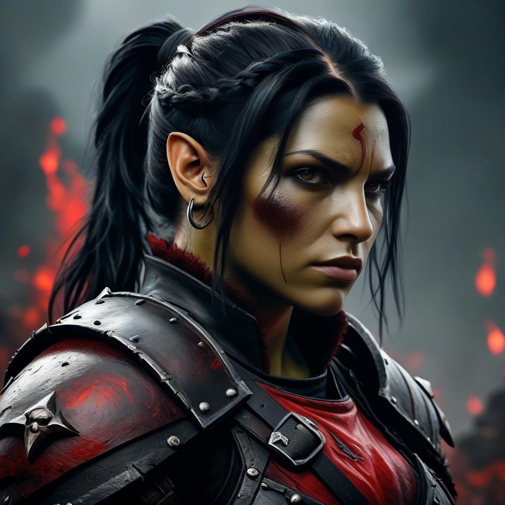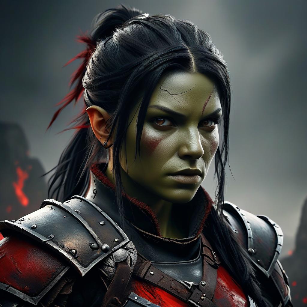 Fantasy character portrait of a female orc with a robust, powerful build resembling Gina Carano. Styled with wild black hair tied in a ponytail, wearing a dark leather armor, enhanced with blood red tones.