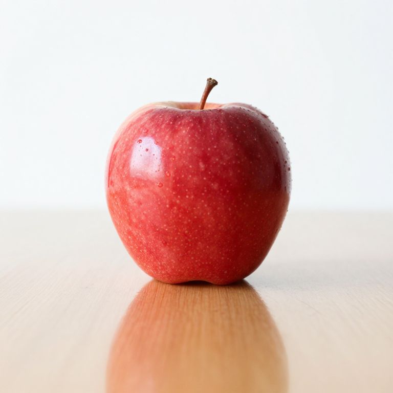 A close-up of a simple composition on a white background, showing a single red apple with a reflection of a wooden table, emphasizing minimalistic design principles