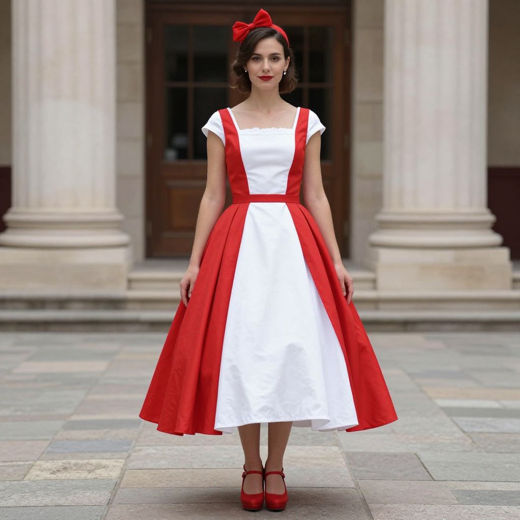 Photograph of a young woman with fair skin and dark brown, wavy hair adorned with a large red bow. She wears a vintage-style, short-sleeved dress with a white bodice and a vibrant red skirt, accented by red suspenders. Her red Mary Jane shoes match her bow and suspenders. She stands on a tiled pavement in front of a grand building with tall, white columns and a dark wooden door in the background. Her red lipstick complements her outfit, and she gazes directly at the camera with a neutral expression. The overall style evokes a classic, 1950s look.