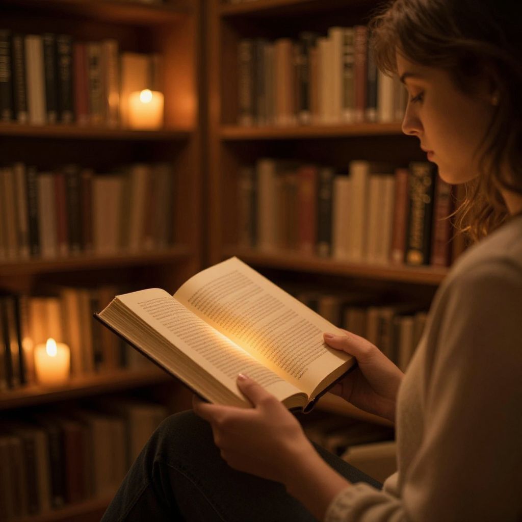 Photograph of a young woman with light brown wavy hair, wearing a beige sweater, sitting in a dimly lit library. She is focused on reading an open book illuminated by a soft, warm glow from nearby candlelight. The background features tall, wooden bookshelves filled with numerous books, creating a cozy and intimate atmosphere. The candlelight casts gentle shadows, enhancing the serene and quiet ambiance of the scene. The woman's profile is visible, highlighting her concentration and the tranquil setting.