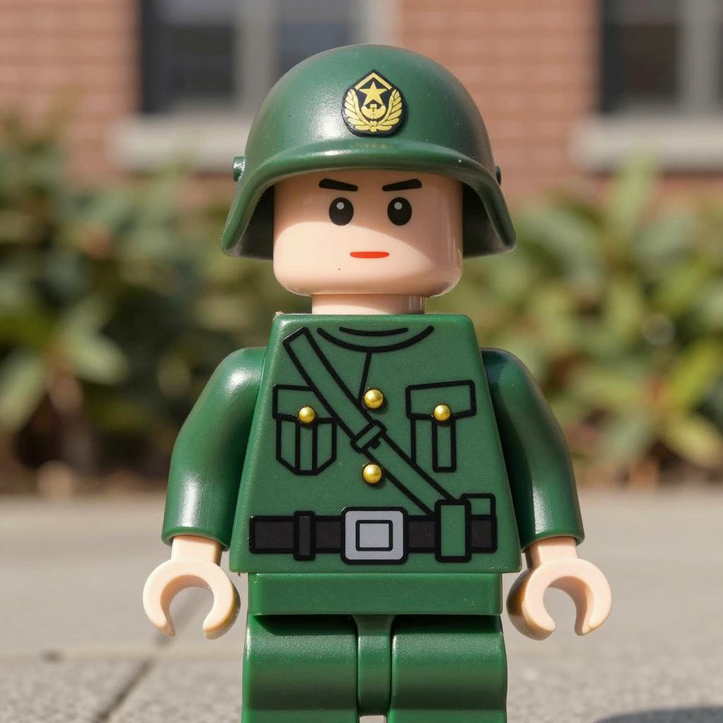 Green toy soldier costume, photograph of a young boy, standing outdoors, wearing a green military uniform, green helmet with insignia, gold buttons, black belt with buckle, green pants, green jacket, serious expression, green foliage and blurred brick building in background, bright sunlight, daytime, realistic, detailed, front view, centered, natural light, urban setting, military cosplay, detailed ures on uniform and helmet, soft focus on background