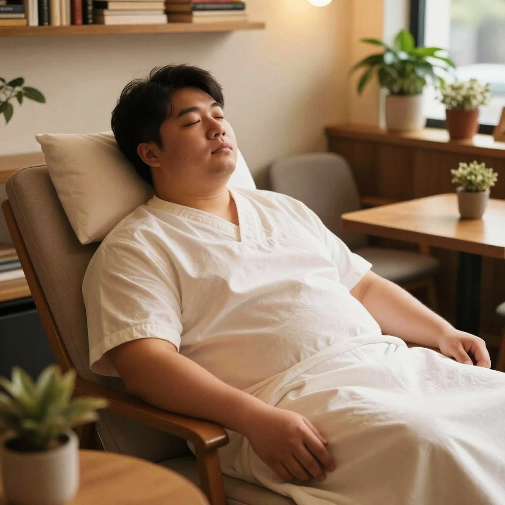 Heavyset body relaxing at a cozy indoor café, cozy warm lighting, surrounded by books and plants, realistic style, casual attire, soft color palette, inviting atmosphere