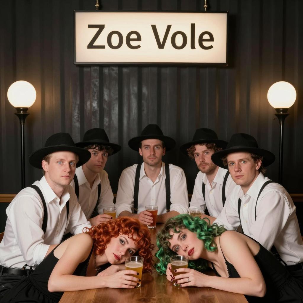 Seven young adults gathered around a wooden table in a dimly lit room with dark vertical slat walls. Five men dressed in white shirts, black suspenders, and black hats sit behind the table, holding drinks with neutral expressions. Two women with curly, vibrant hair, one red and one green, lie on the table in front of the men, also holding drinks. Warm light bulbs are on both sides and a bright sign above reads 'Zoe Vole.'