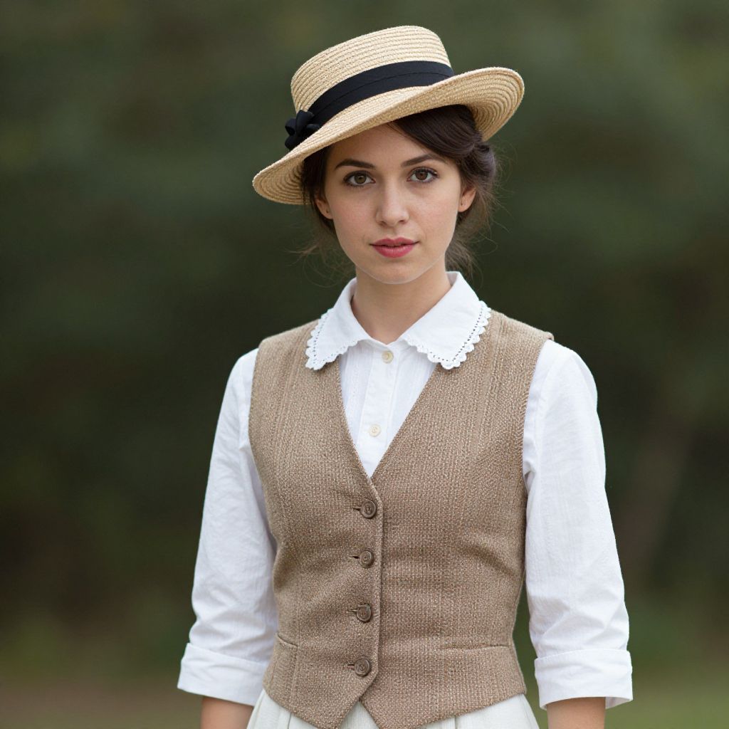 "Vintage Retro Costume, woman in a hat and vest standing outside"