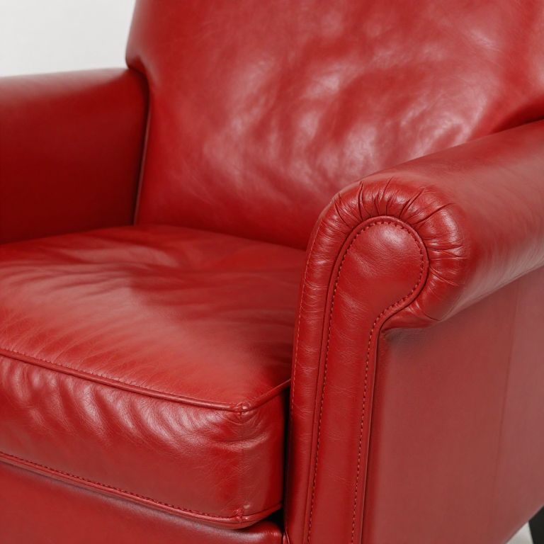 Close-up view of a vibrant red leather club armchair showcasing its polished finish, structured stitching, and classic design, indicative of mid-century craftsmanship circa 1940, available for sale at 1stdibs.