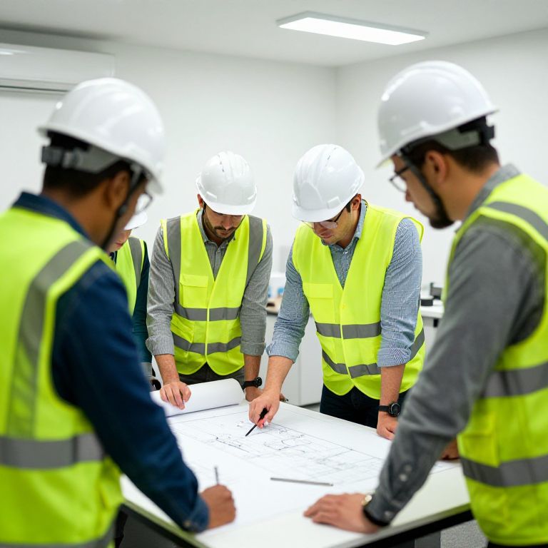 A group of engineers wearing hard hats and safety vests, collaborating on a blueprint table in a well-lit engineering office.