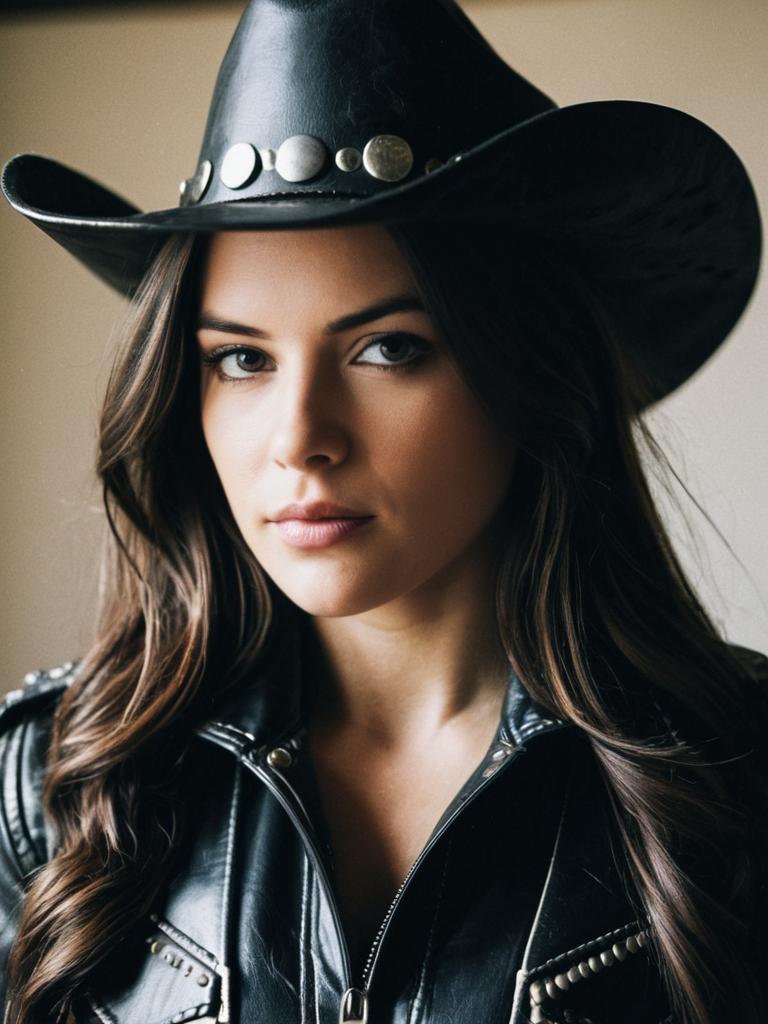 Woman in Leather Cowgirl costume, professional cosplay editorial headshot, sharp detail