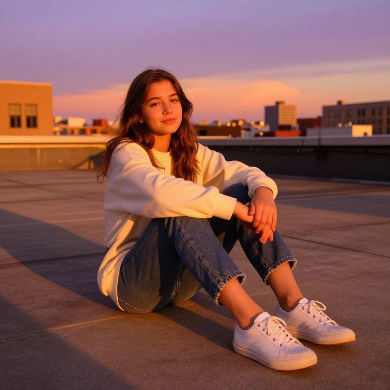 Brown hair girl teen sitting on a city rooftop at sunset, warm golden light casting long shadows, urban skyline in the background, relaxed pose with a slight smile, wearing trendy streetwear, dynamic composition with orange and purple hues in the sky