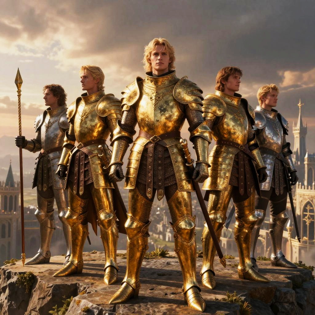 Blonde male characters in medieval fantasy setting, clad in ornate golden armor, standing heroically on a cliff overlooking a sprawling kingdom, dramatic sunset sky, detailed textures