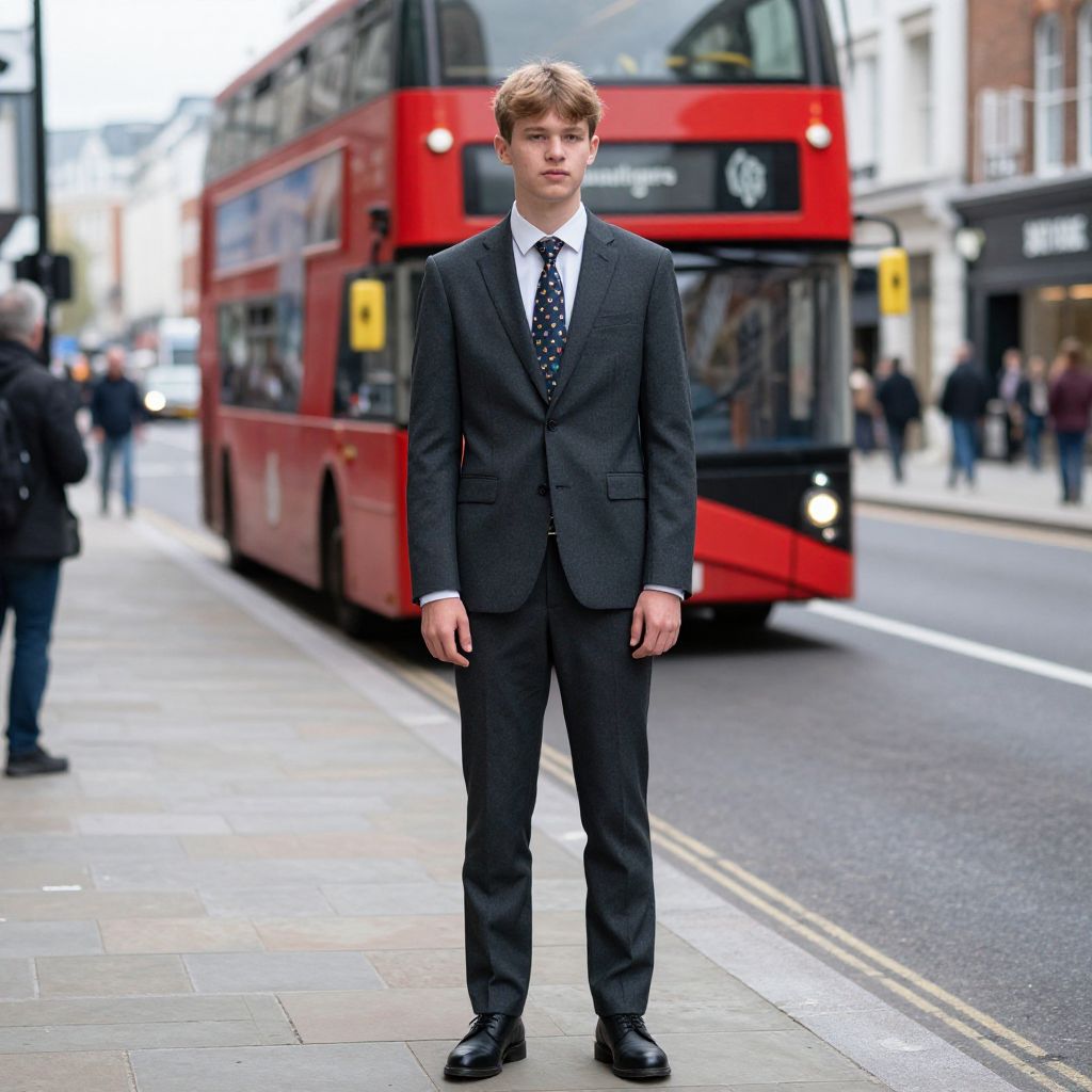 Photograph of a young Caucasian man with short, light brown hair standing on a city sidewalk. He's wearing a dark gray suit, a colorful diamond-patterned tie, and black shoes. A bright red double-decker bus is in the background, along with blurred pedestrians and street buildings. The sidewalk is paved, and the street has yellow road lines. His expression is neutral.