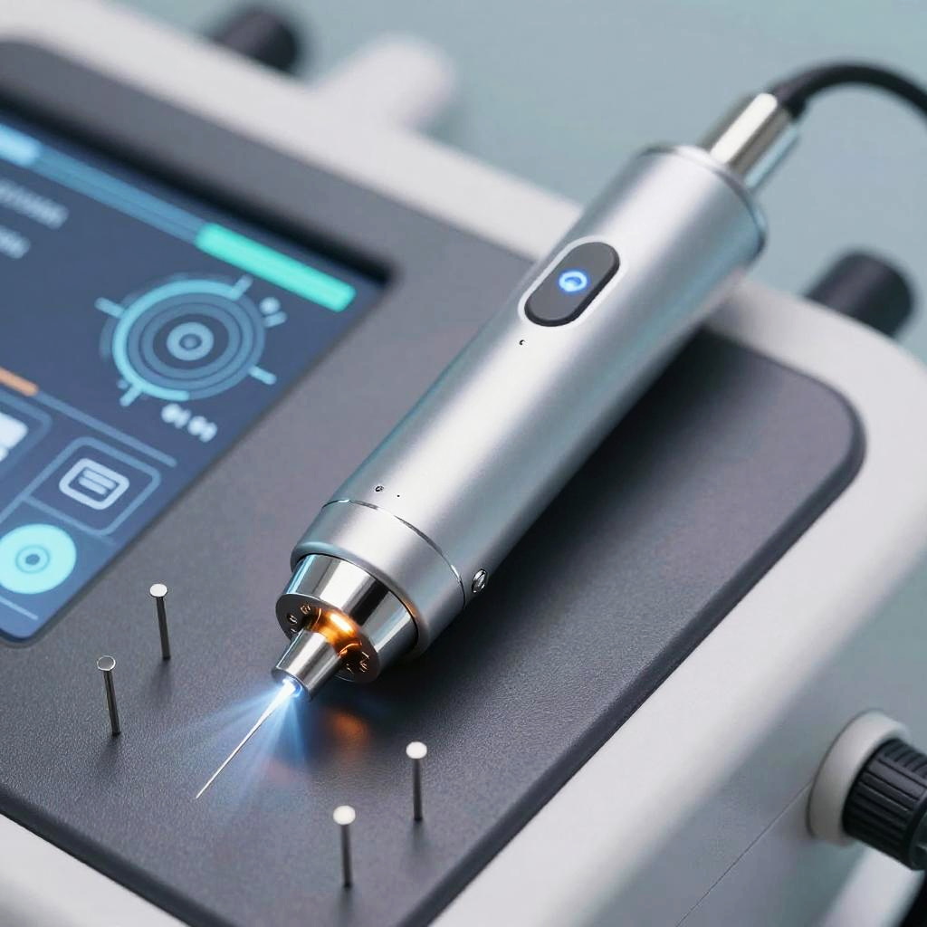 Close-up of a piercing generator tool, sleek metallic design with glowing core, emitting pulses of energy, surrounded by floating piercing studs and needles, digital interface with holographic controls, ultra-detailed, futuristic medical equipment