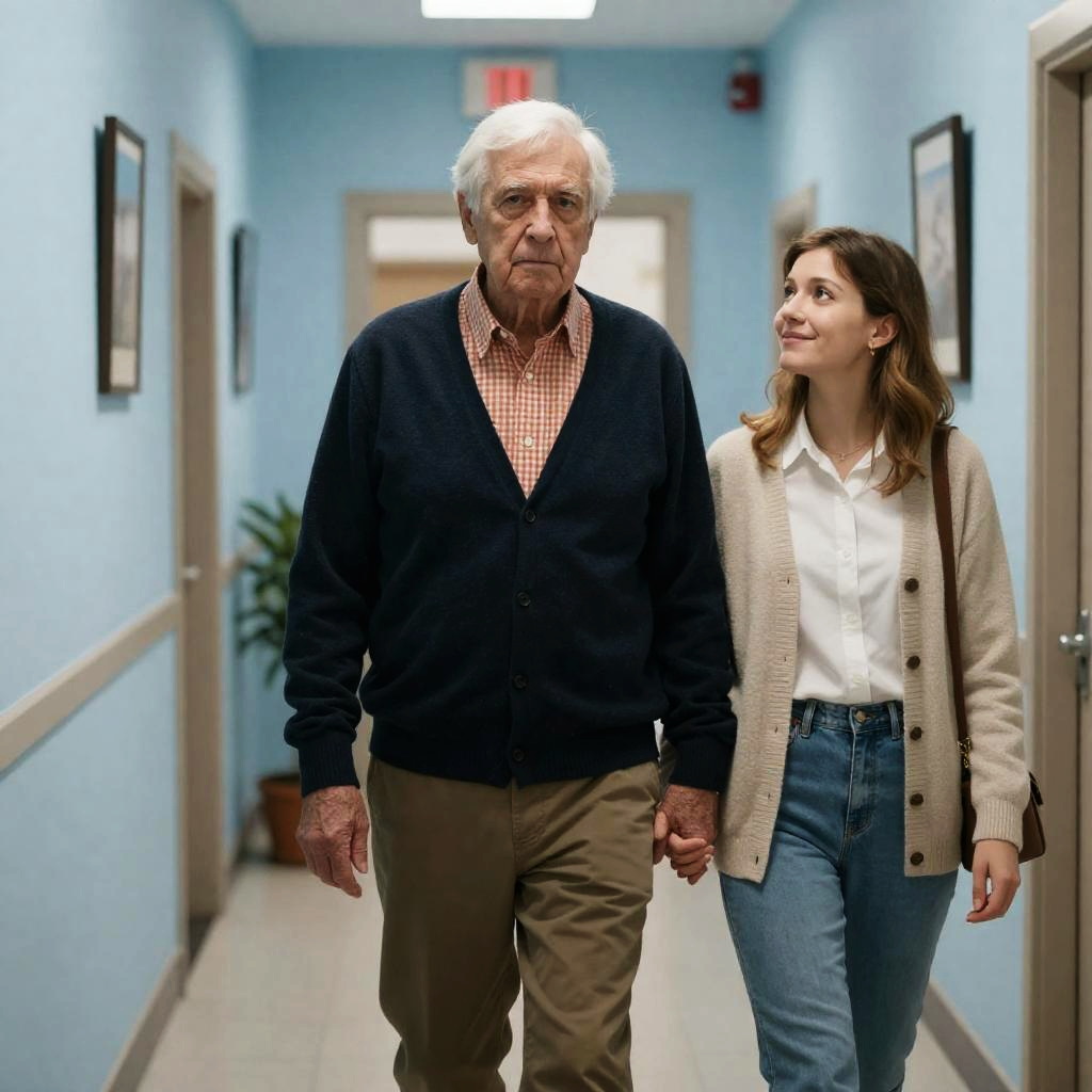Photograph of an older man and a younger woman in a garden. The man, with gray hair, wears a light blue shirt, points upward. The woman, with light brown hair, wears a pink knitted sweater, looks at his finger. Green foliage and pink flowers in the background. The man's arm is around the woman's shoulder. Both have calm expressions. The woman's sweater has large, loose sleeves. The man and woman stand close together.