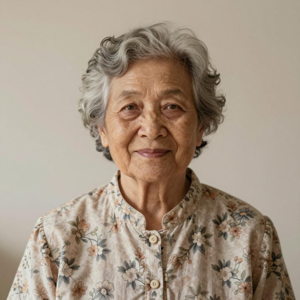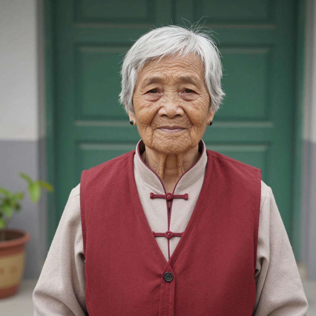 Portrait of an elderly Asian woman standing outdoors on a rock by a river, wearing a beige kimono with a brown belt, red-orange pants, and black sandals. She has short gray hair and a small smile, set against a natural rocky background with green foliage. The image captures a serene expression in natural daylight, showcasing traditional ethnic attire in a peaceful landscape.