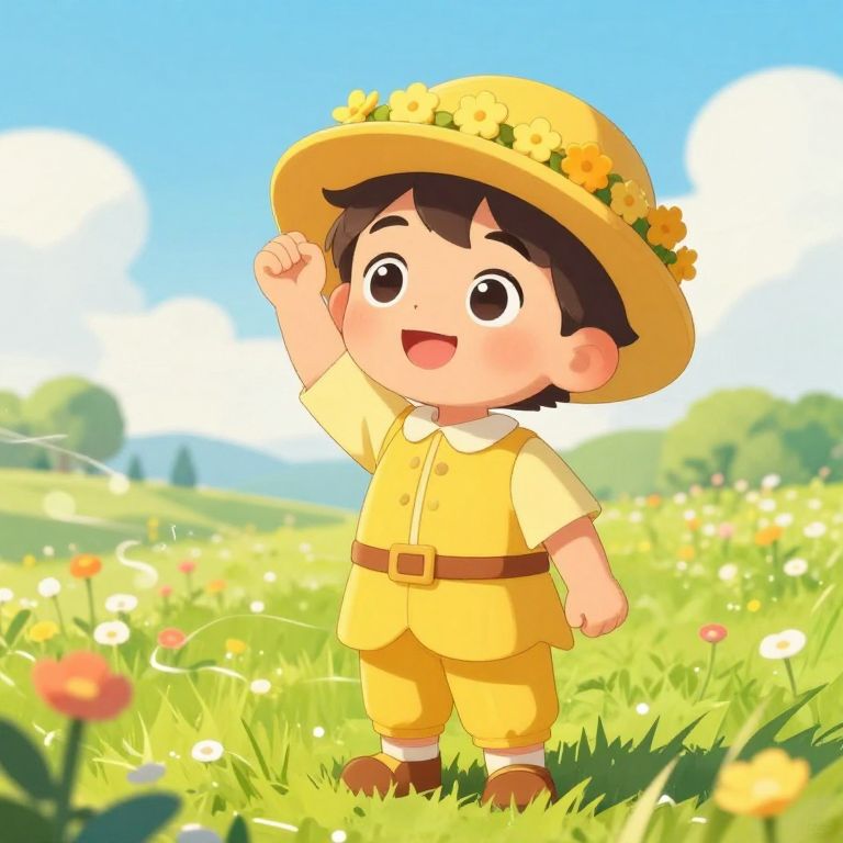 A young boy with bright, curious eyes and a cheerful smile, wearing a vibrant yellow outfit complete with a yellow tunic, pants, and a yellow hat, standing proudly with a small crown of golden flowers on his head, standing in a sunny meadow with blooming flowers and a soft breeze blowing through the grass, colorful and whimsical atmosphere, cartoon-style illustration with soft lighting and joyful tones.