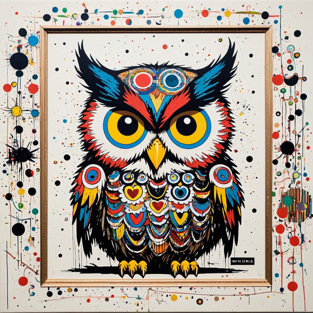 A vibrant artwork blending fauvism, expressionism by Henri Matisse, Egon Schiele, featuring a cute baby owl, surrealistic colors and intricate textures
