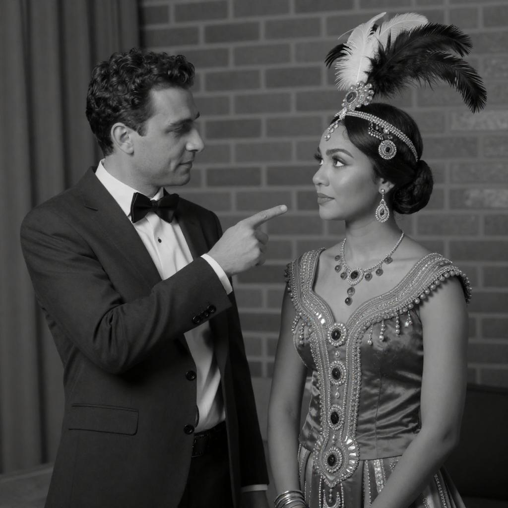 Black and white photograph of a sophisticated couple. The man wears a dark suit, tie, white shirt, and a black fedora hat, with an intense gaze. The woman has curly hair, adorned with an ornate tiara, dark lipstick, and strapless embellished dress. She has one arm around the man's shoulder and her hand resting on his chest. The background features draped curtains and elegant, intricate patterns, enhancing the vintage and classy atmosphere.