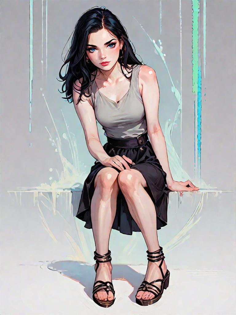 Digital artwork of a full-body shot of a woman with a realistic face, wearing a fitted light green midi dress with a subtle dot pattern and off-the-shoulder short sleeves. She is posed seated with legs bent, wearing silver open-toe mule heels, against a white studio background with abstract light blue and yellow elements.
