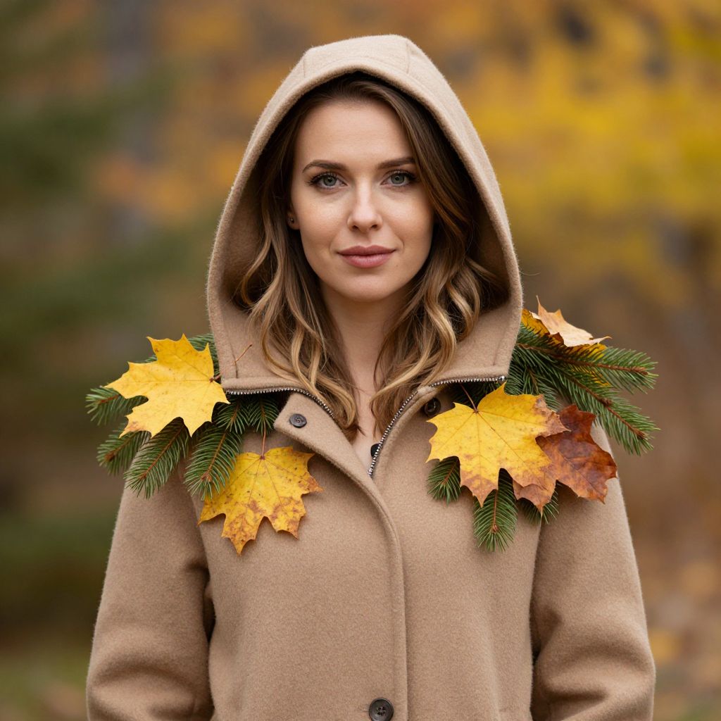 Photograph of a Caucasian woman with fair skin and wavy brown hair, wearing a beige, hooded coat adorned with bright yellow and orange autumn leaves and green pine branches on the shoulders. She has blue eyes, subtle makeup, and a slight smile. The background is softly blurred with autumnal colors, predominantly yellow and brown, suggesting an outdoor, forested setting in fall. The coat's texture appears warm and woolen, with a zipper partially visible beneath the hood. The overall composition exudes a cozy, seasonal vibe.