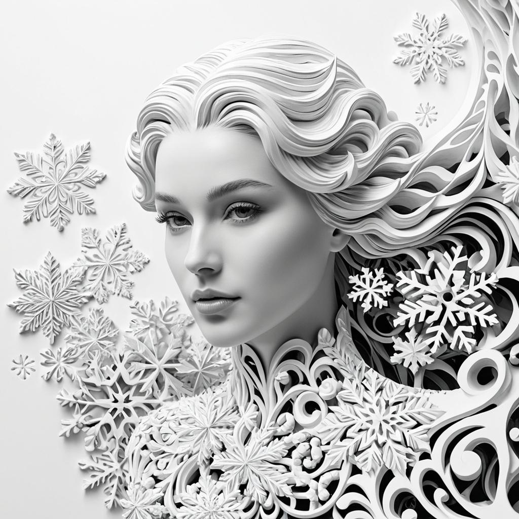 A hyperrealistic 3D white sculpture of a woman with flowing hair and elaborate clothing, intricately detailed with whimsical snowflake patterns integrated throughout the design. The sculpture is set against a white background, combining abstract vector fractal and zentangle elements with smooth 3D shading in the style of Carole Feuerman.