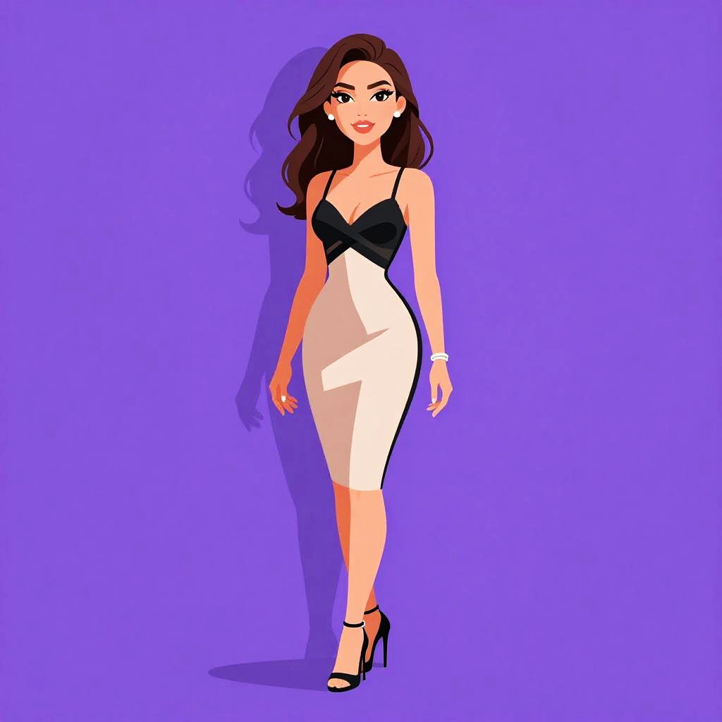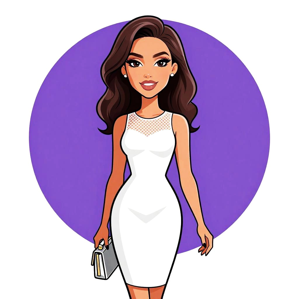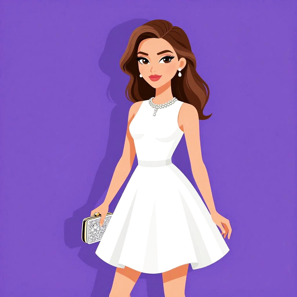 Woman with pretty face and pretty hair. Woman, elegance, white fitted midi dress with a slit, sleeveless, gold chain neckline embellishment, strappy gold heels, minimal accessories --sref 1467