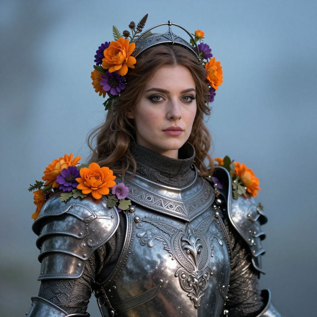 A striking portrait of a woman adorned in intricately detailed armor with floral embellishments, blending medieval fantasy and nature-inspired elements. Her headpiece and shoulder armor are complemented by vibrant orange and purple flowers, set against a softly lit, ethereal blue background that enhances the mystical atmosphere.