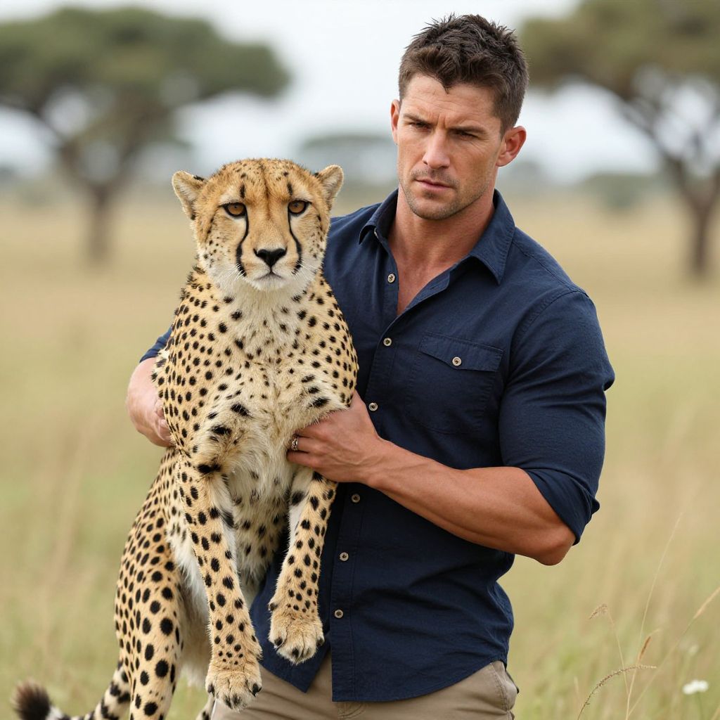 Photograph of a muscular, handsome white man with short dark hair, wearing a navy blue button-up shirt. He stands in a savanna, holding a cheetah with a focused gaze. The cheetah's golden-yellow coat with black spots contrasts with the man's dark shirt. The background shows blurred, tall grasses and trees under a bright sky. The man's expression is serious and protective.