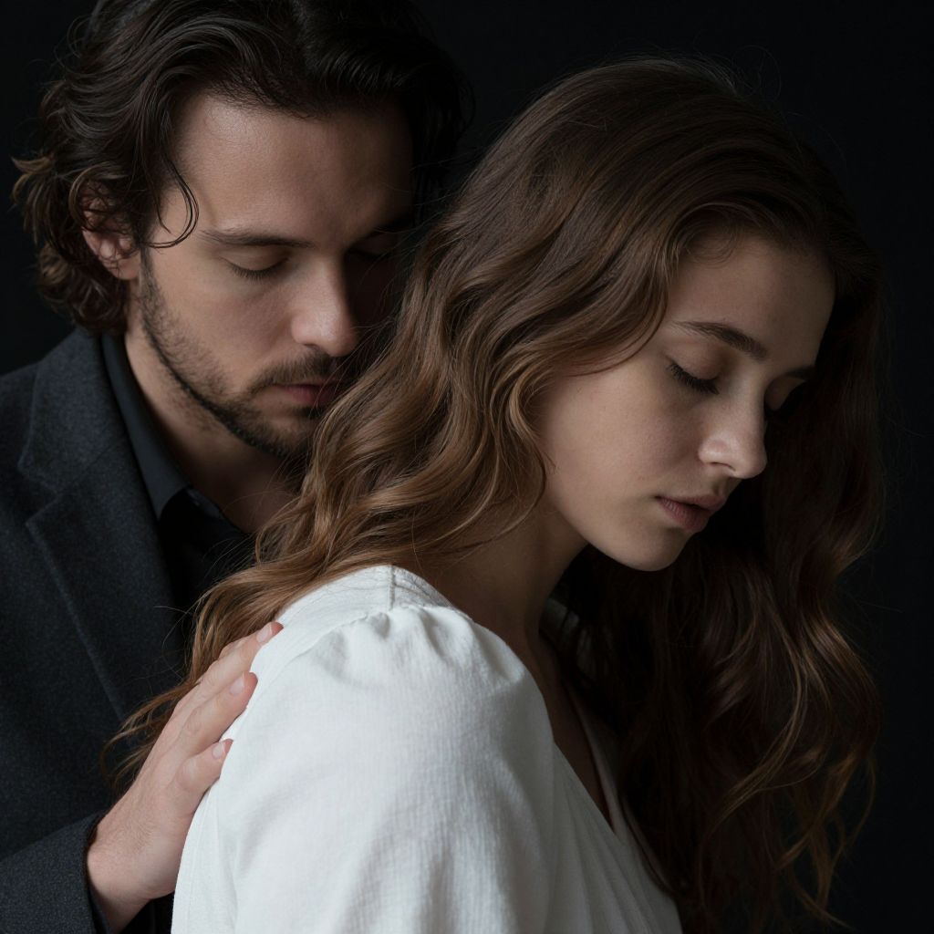 A moody, close-up photograph of a couple. The man, with wavy dark hair and a beard, gently holds the woman's shoulder. She has long, wavy brown hair and wears a white, puffy-sleeved top. Both have their eyes closed, exuding a sense of intimacy and sadness. The background is dark, making them the focus. The lighting is soft, highlighting their emotional connection.