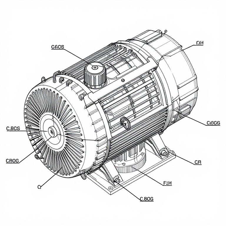 How to draw generator blueprint, detailed schematic of an electric generator with parts labeled, isometric view with fine lines, monochrome engineering drawing style, focus on mechanical components and structure, instructional art for learning.
