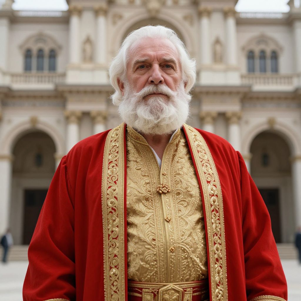 A distinguished, elderly man with a magnificent white beard, exuding wisdom, and wearing a vibrant red and gold ornate outfit, is standing confidently in front of a grand, architecturally detailed building. Cinematic lighting, ultra-realistic, 8k.