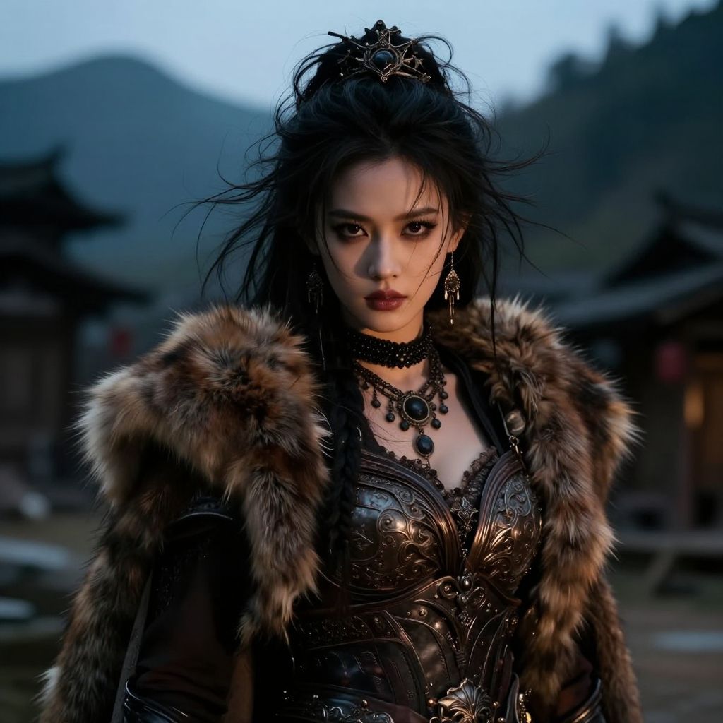Photograph-style digital artwork of a fierce, dark-haired Asian woman with pale skin, intense gaze, and dramatic makeup. She wears a black, intricately designed, armored dress with a high collar and a luxurious fur coat. Her hair is styled in a messy, voluminous updo adorned with a black, jeweled headpiece. She also wears a black, elaborate necklace with a large, central gem. The background is blurred, featuring ancient, wooden buildings and misty, blue-toned mountains, enhancing the mystical and historical atmosphere. The lighting highlights her determined expression and detailed attire.