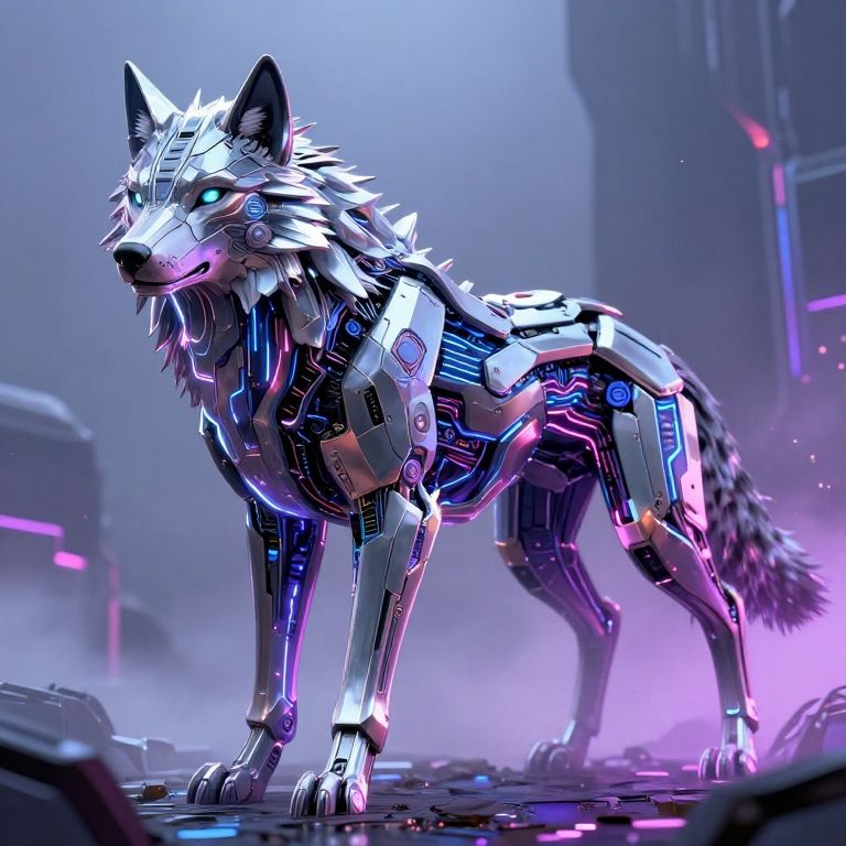 Vqgan style cybernetic animal, a majestic mechanical wolf composed of fractal metal parts and glowing circuit veins, standing on a neon-lit futuristic terrain, misty atmosphere with electric sparks, vivid colors, ultra-detailed digital painting style