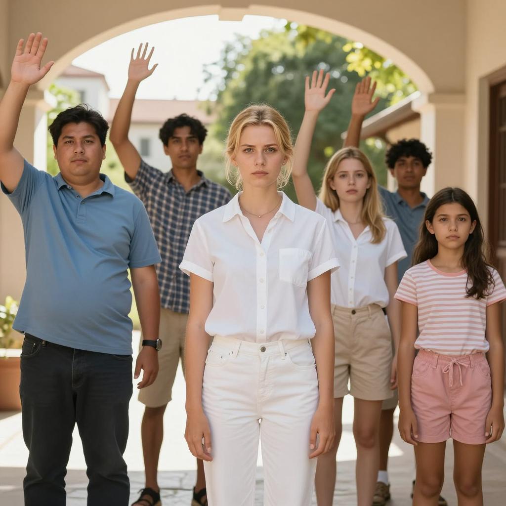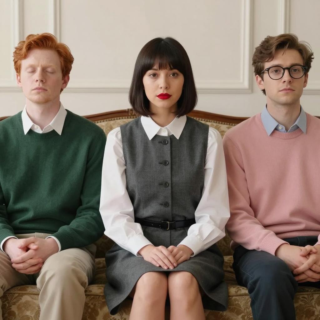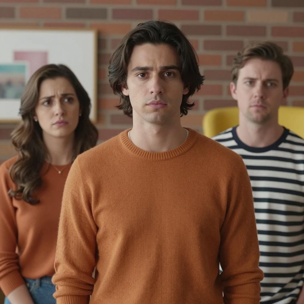 Blonde man with shoulder-length hair in pink and white striped turtleneck sits in front row. Behind him, blonde woman in red cardigan, young man in plaid shirt and navy vest, and curly-haired young woman. Stairs and classroom background. Young man holds open book. All have neutral to slightly intense expressions. Four people.