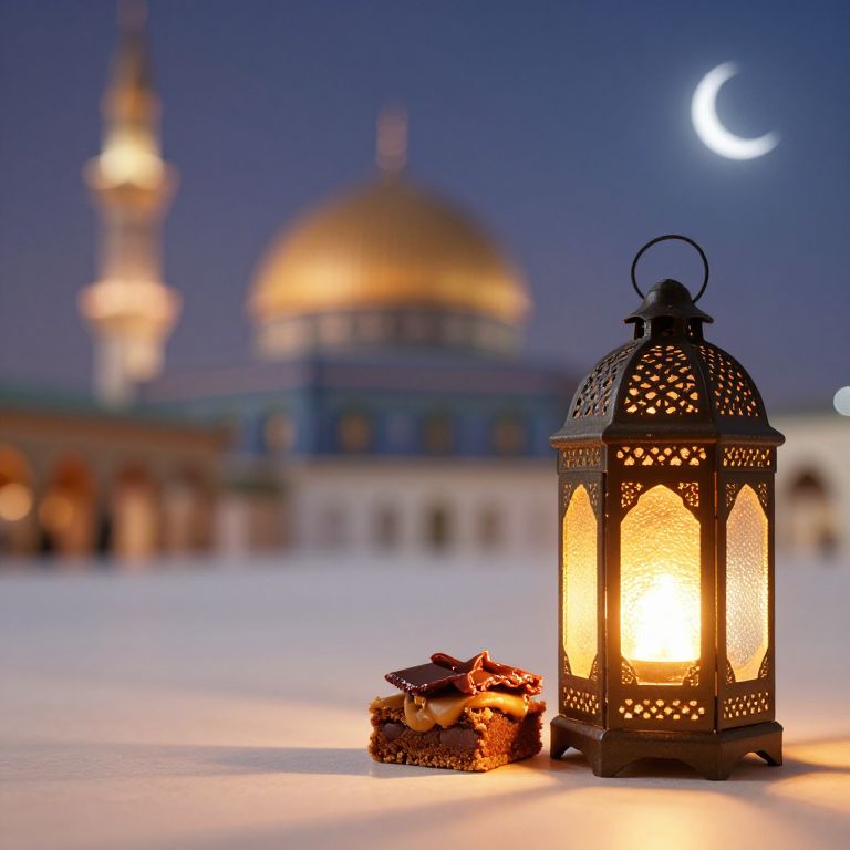 Photograph of a nighttime scene featuring a glowing black metal lantern with intricate cut-out patterns, positioned in the foreground on a white, snow-like surface. Beside the lantern is a stack of gold-wrapped dates. In the background, a blurred mosque with a golden dome and a minaret is illuminated, with a crescent moon visible in the dark blue sky. The warm light from the lantern contrasts with the cool night sky, creating a serene and festive atmosphere.