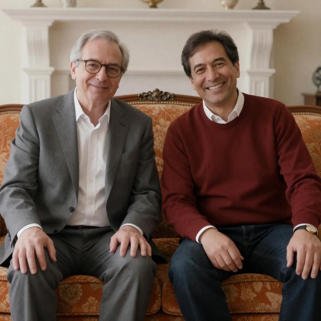 Photograph of two middle-aged men sitting on an orange floral-patterned couch. The man on the left has gray hair, glasses, a gray suit, and a white shirt, smiling slightly. The man on the right has dark hair, a red sweater over a white shirt, and is smiling more openly. A white ornate mantelpiece is in the background.