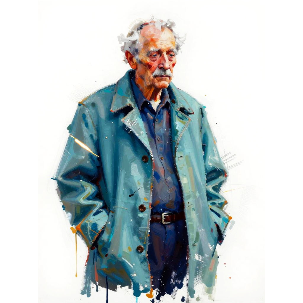 Expressionist semi-abstract portrait of disjointed elderly man draped in teal coat, arms fractured with ochre light, rendered in lyrical acrylic mix using drips and cross-hatched palette knife textures, high-contrast bold colors, loose gestural strokes and textured paint ridges, minimal white negative space with asymmetrical crop, cobalt-shadow accents and suggestive contours, emotive wistful reflection filled with gentle yearning, contemporary art poster vibe, painterly chaos with subtle drips, unresolved edges, luminous highlights.