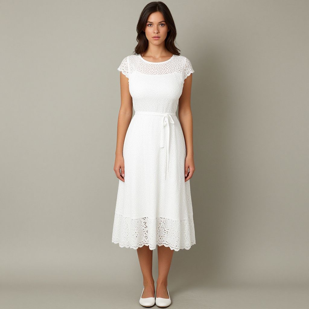 "Woman, romantic summer style, eyelet lace white dress, short sleeves, round neckline, cinched waist, knee-length hem, plain white fabric with patterned lace overlay, simple white flats, plain backdrop.. Sexy. Pretty face and beаutiful eyes. Big breasts."