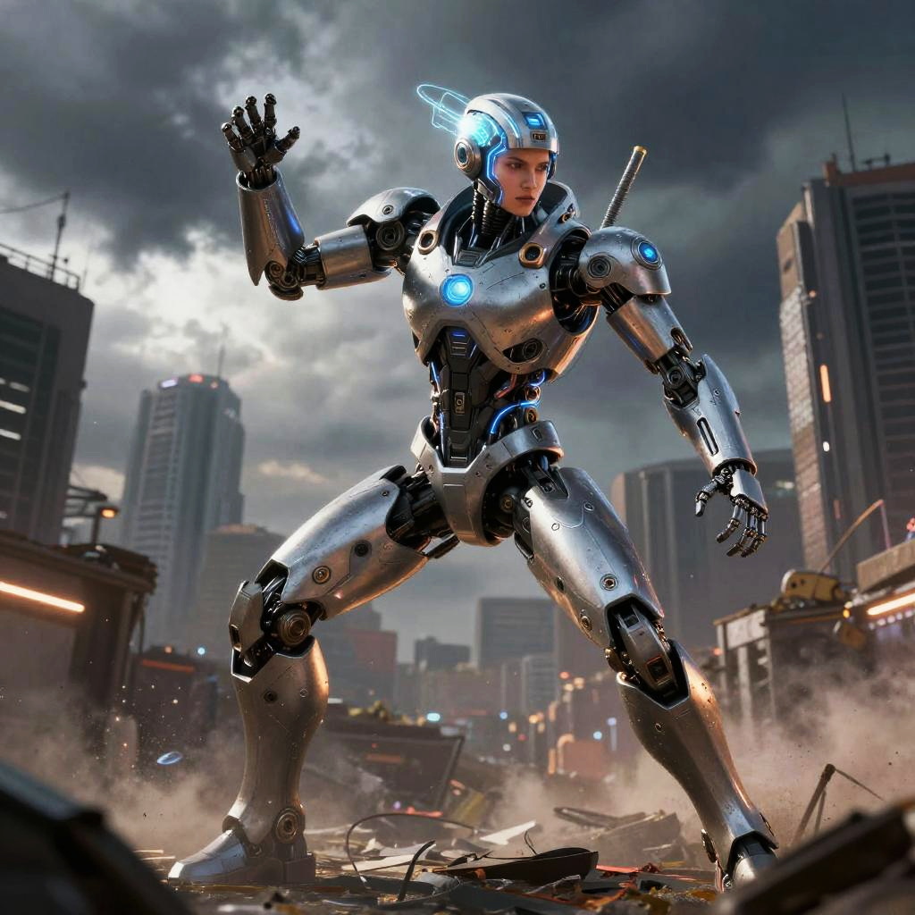 AI Ary, a cybernetic warrior blending human and machine elements, equipped with robotic limbs and a luminous neural interface, poised in a post-apocalyptic urban environment under a stormy sky, dynamic and powerful pose, vivid and intense color palette.