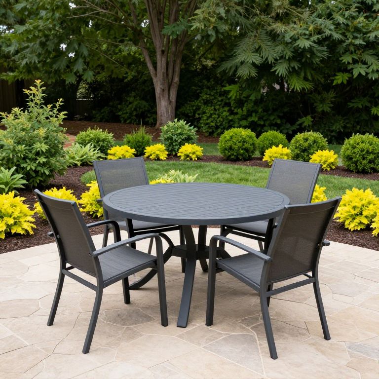Well-maintained backyard patio featuring a dark gray oval dining table surrounded by six matching chairs, set on a light beige stone paver surface, bordered by neatly landscaped garden beds with vibrant green shrubs and yellow foliage, framed by tall trees in the background.