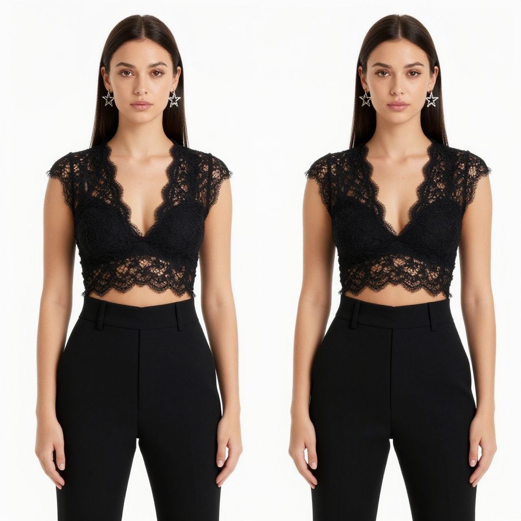 A stylish woman poses confidently in a contemporary chic black lace crop top featuring a plunging neckline, paired with high-waisted black trousers. The elegant lace pattern and the star-shaped earrings complete the sophisticated and modern look against a simple white backdrop.