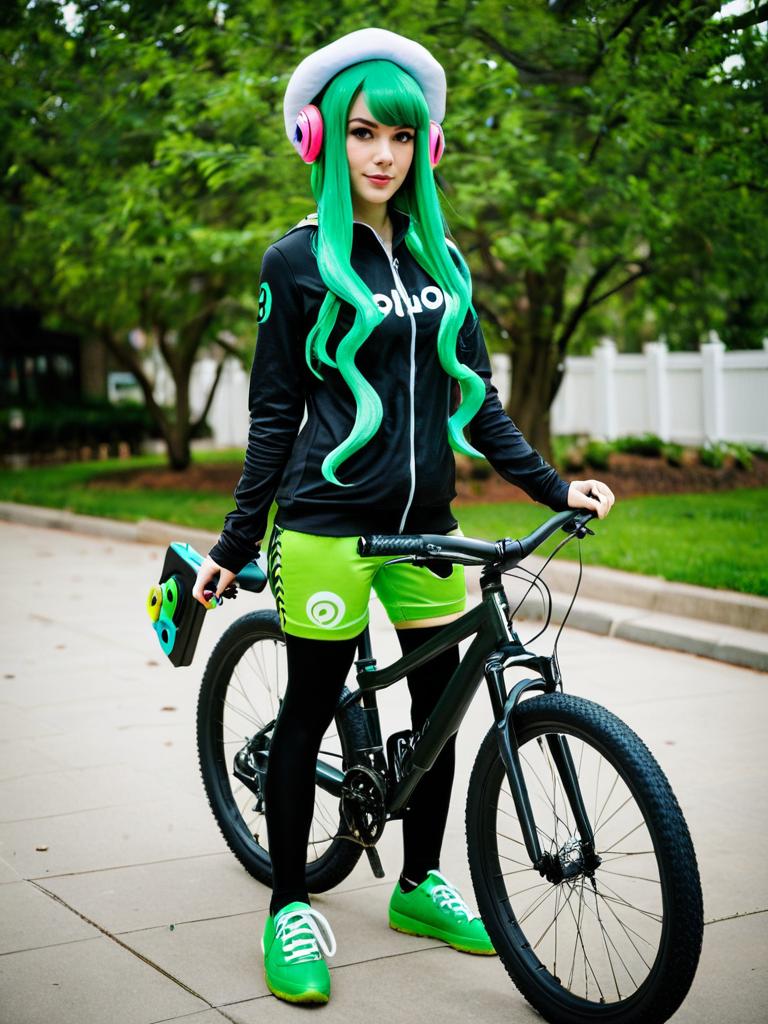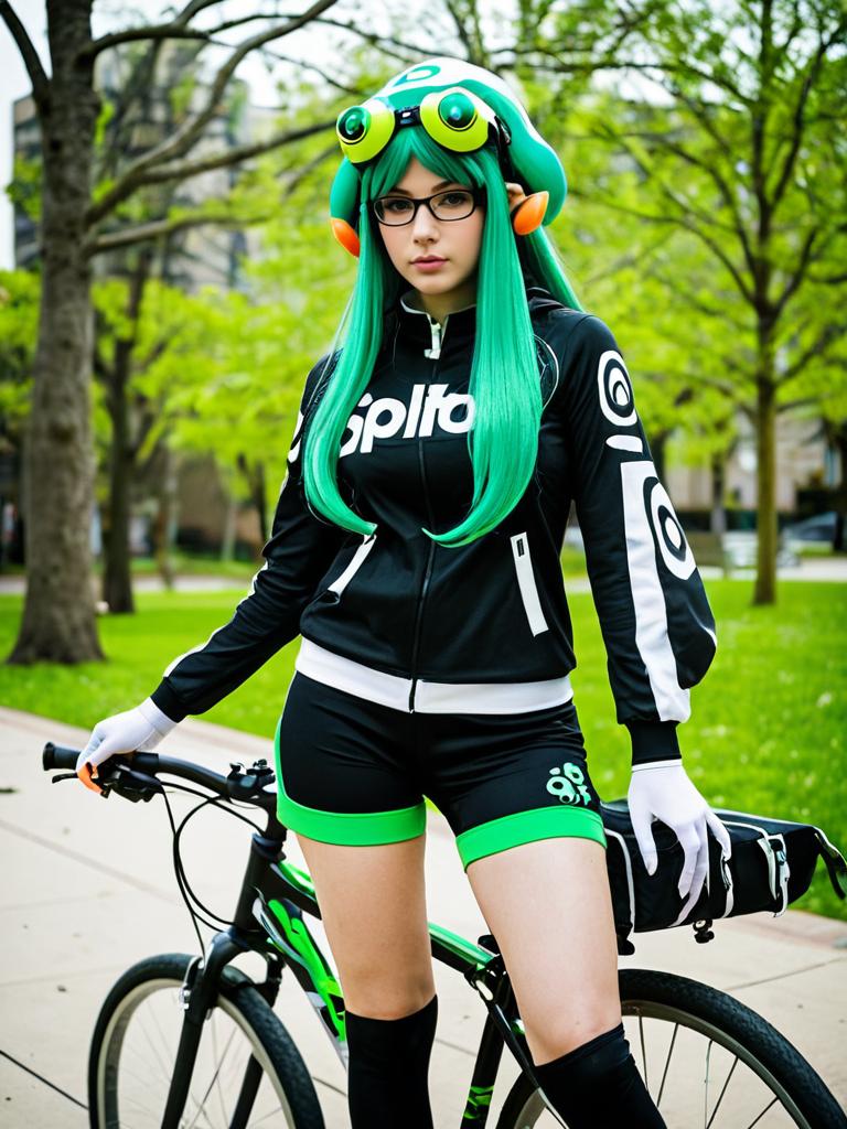 Photo-realistic full-body cosplay of a person dressed as Agent 3 from the video game Splatoon. The cosplayer has long green tentacle-style hair, pointed elf-like ears, and wears black-rimmed glasses. The costume includes a black and green Squidbeak Splatoon headgear, black and green bike shorts, a black long-sleeve jacket with white Splatoon branding, white gloves, and black thigh-high socks. The cosplayer stands next to a black and green bicycle in an outdoor park setting with trees and greenery in the background.
