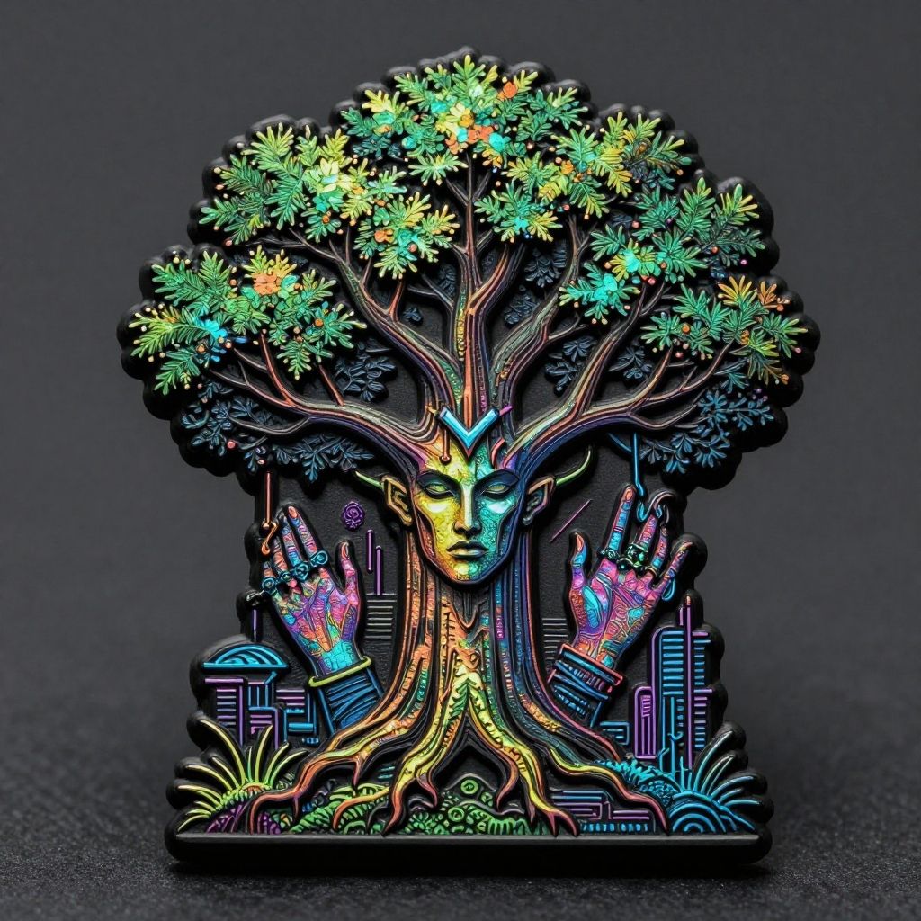 Vibrant, neon-colored digital artwork of a tree with a serene, glowing face, hands emerging from roots, and cityscape background.