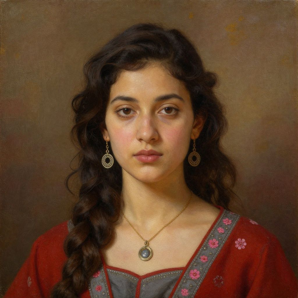 Oil portrait captures the serene visage of a young woman with dark, wavy hair styled in a side braid, adorned with dangling earrings featuring circular pendants, complemented by a delicate necklace with a pendant and a red garment embellished with gray and pink accents, set against a textured background with earthy tones.