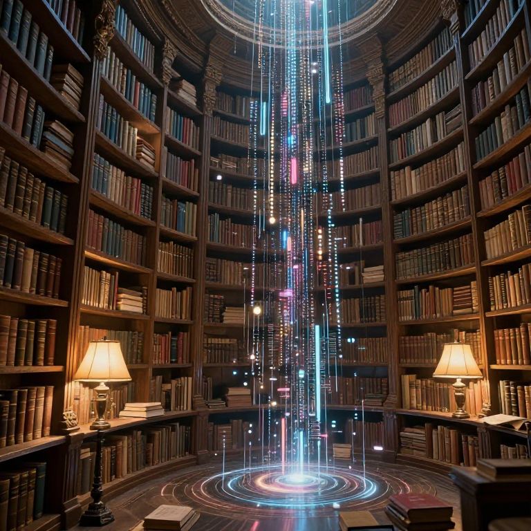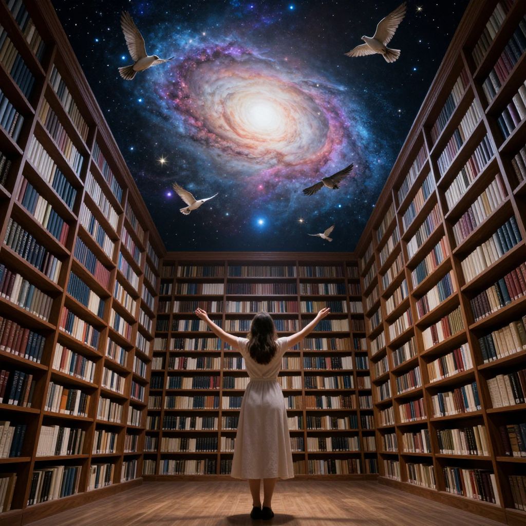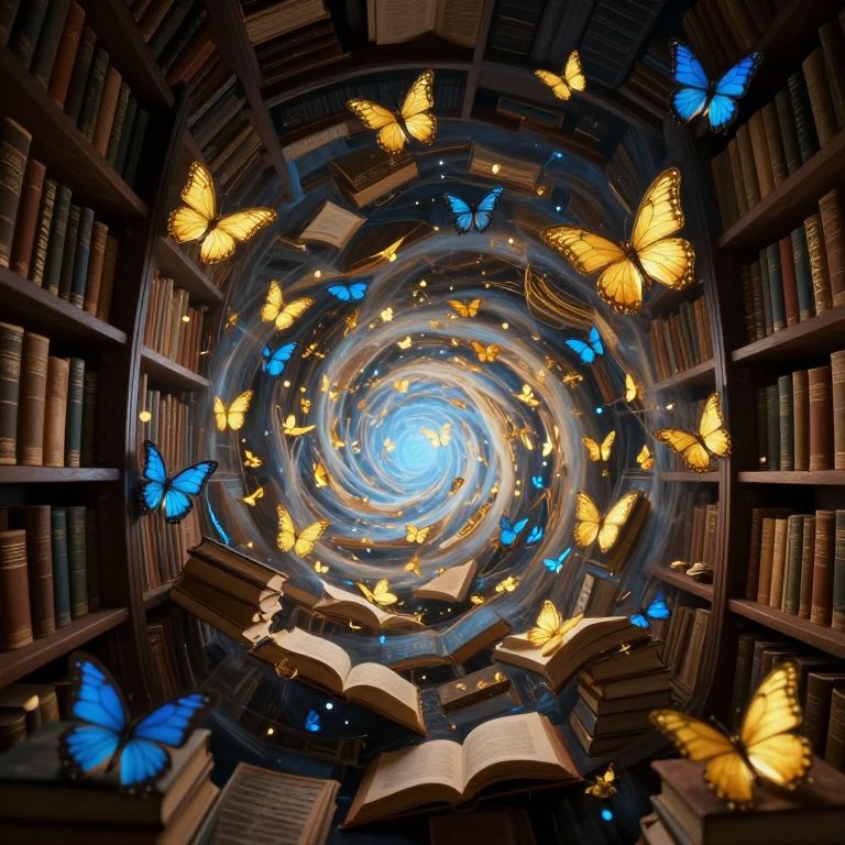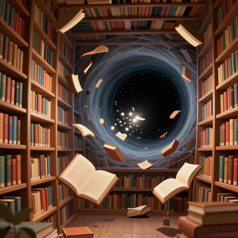 Books rest scattered across a dark, flooded library floor, flanked by towering shelves filled with countless volumes, as a swirling, luminous vortex spirals upward through the ceiling, illuminating the scene with ethereal light.