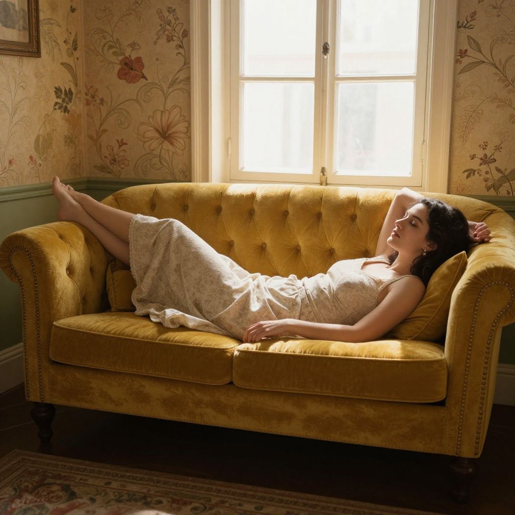 Photograph of a woman with fair skin and dark hair, reclining on a mustard-yellow, velvet tufted sofa in a sunlit room. She wears a light, patterned, sleeveless dress, with one arm resting on her head and the other on the sofa's armrest. Her legs are stretched out along the length of the sofa. The background features floral-patterned wallpaper and a large, sunlit window with white trim. The room has a vintage, cozy atmosphere with soft, warm lighting. The woman appears relaxed and contemplative.