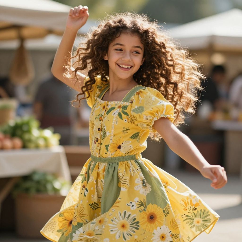 A cheerful girl with a loose, curly hairstyle and long, voluminous hair in a floral yellow and green costume dances in a sun-drenched farm market, her face glowing with joy, the soft sunlight catching the movement of her curls and the vibrant fabric of her costume
