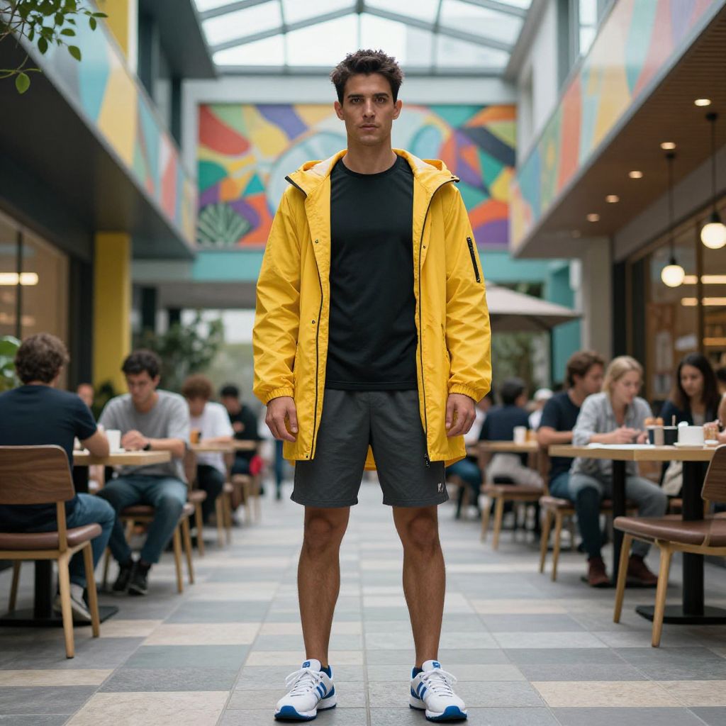 A man, black athletic long-sleeve shirt, charcoal gym shorts, bright yellow packable parka, white and blue tennis shoes, modern glass atrium, vibrant murals, bustling café, cinematic style, focused expression Man has masculine face and piercing eyes