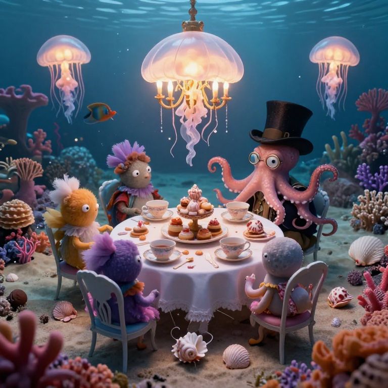 Craft an enchanting underwater tea party scene in the whimsical style reminiscent of Charles Dodgson's imaginative world. In this surreal tableau, curious sea creatures gather around a lavish table set with teacups and pastries fashioned from seashells and sand. Softly glowing jellyfish chandeliers illuminate the scene, casting an ethereal glow on the coral reef surroundings. From an aerial perspective, showcase the intricate details of this fantastical underwater world as it comes to life under the watchful gaze of a wise old octopus wearing a top hat and monocle. This whimsical gathering evokes both wonder and nostalgia, inviting viewers to embark on a mesmerizing journey beyond the bounds of reality.