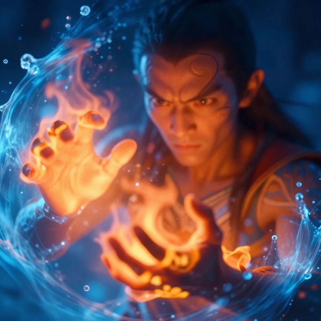 Close-up of avatar bender hands manipulating fire and water simultaneously, intense focus, ethereal blue and orange hues, fantasy art with intricate hand textures